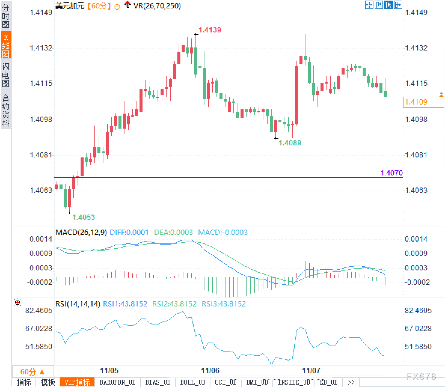 美元兑加元小时图显示,1.4139受压回落至1.4089后在1.4100附近横向整理,1.4070为上行以来的关键回档位。MACD柱体负值收窄后转为趋平,快慢线贴合,动能偏弱未现明确背离。RSI自高位回落至40—45区间,超买已释放,节奏转震荡。若持续受阻于1.4130—1.4140,上方压力带有效,区间维持概率高;下破1.4089并逼近1.4070,则多头短线结构走弱;反之,放量上穿并稳于1.4140上方,才指向更高区间。当前1.4109,位于区间中部,方向信号有限。
