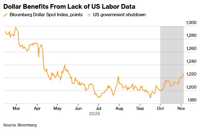 由于政府停摆导致经济数据匮乏,美元在10月份创下今年第二好的单月表现。