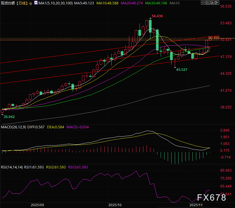 汇通财经APP讯——周二(11月11日)亚洲交易时段,现货白银继续反弹,实现五连阳,交投于50.69美元附近,逼近51.00美元关键关口。之前同样的结论,每次商品价格的加速都是情绪高点,此时获利了结都不会是最差的选项。作为无息贵金属,白银在当前美国经济不确定性升温的背景下,凭借美联储短期降息预期获得强劲看涨动能,同时叠加关键矿产属性带来的长期支撑,市场多空博弈持续升级,成为交易市场关注焦点。