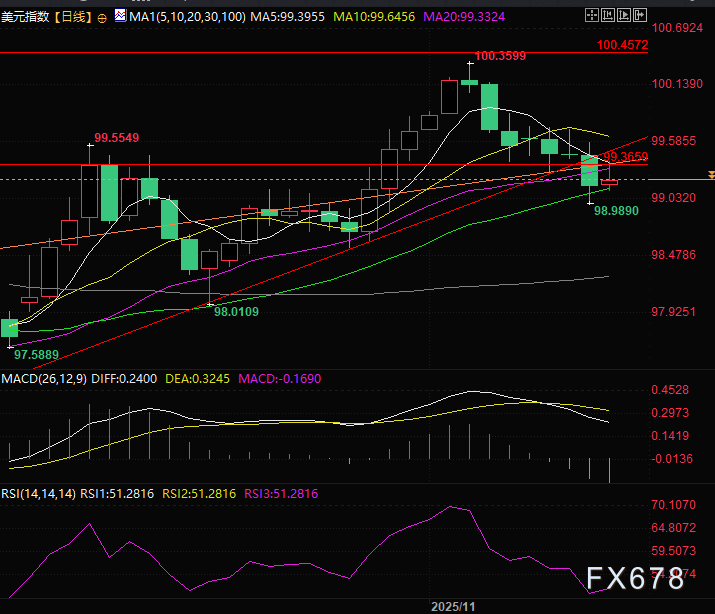 美元指数也连续走弱,跌破关键压力位后反弹不过压力位,指数走势继续承压。