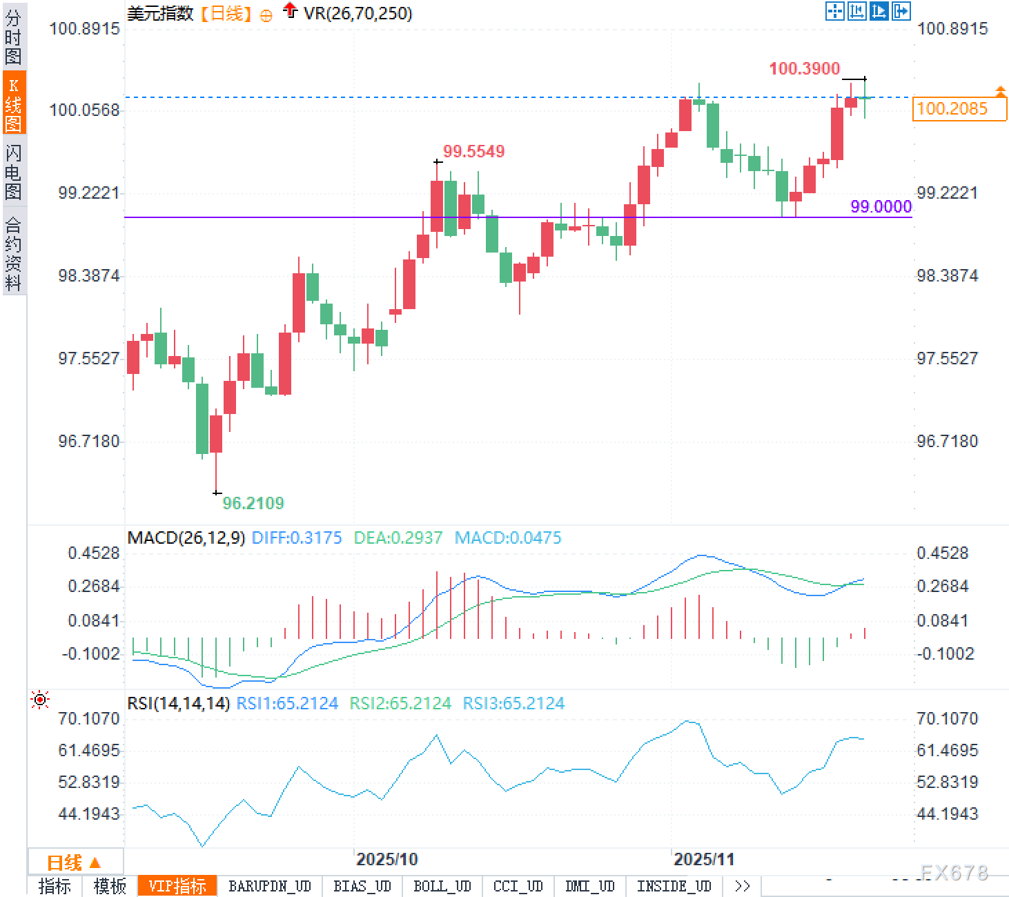 从日线结构看,美元指数自96.2109低点抬升后维持上行通道,近期在100关口上方高位整理,显示多头趋势仍在但进入阻力密集区。前高100.3900附近形成短线压力,K线连续小实体与上下影交错,反映分歧加大、动能放缓。下方99.0000为关键平台支撑位,亦为前期突破后的回踩区域,决定中期趋势的稳定性。