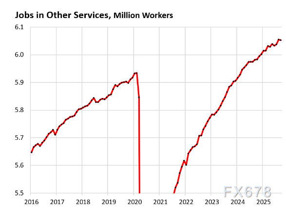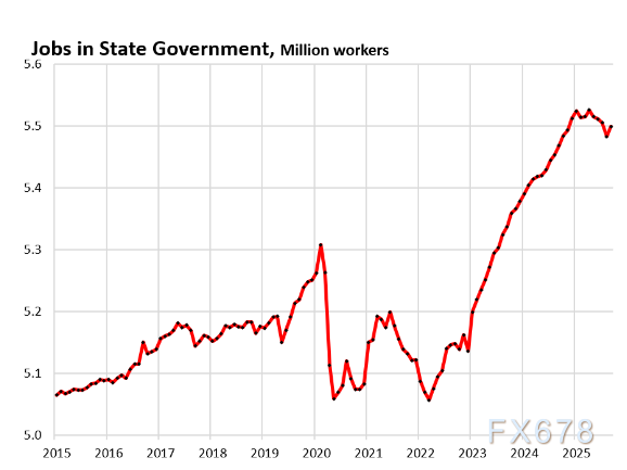 因此,剔除联邦和州政府后的9月非农就业人数较8月增加10.6万人,6月曾出现零增长,此后该趋势已逐步回升(图表中蓝色柱形)。