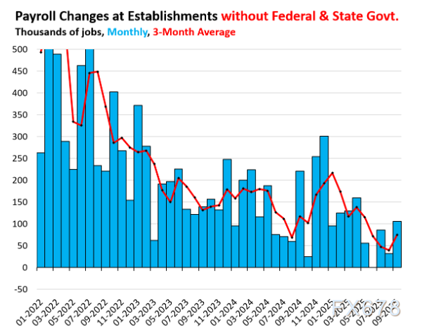 过去三个月累计新增就业18.7万人,同期联邦政府裁员2.5万人,州政府裁员1.2万人。三个月平均新增就业人数升至6.2万人(红色线条)。