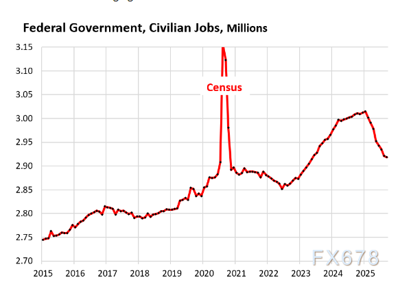 政府薪资名册不包含政府承包商员工,这类员工被归入私营部门类别(如“专业和商业服务”)。今年该类别就业人数出现了一些下滑,但无法确定其中有多大比例源于政府削减支出。
