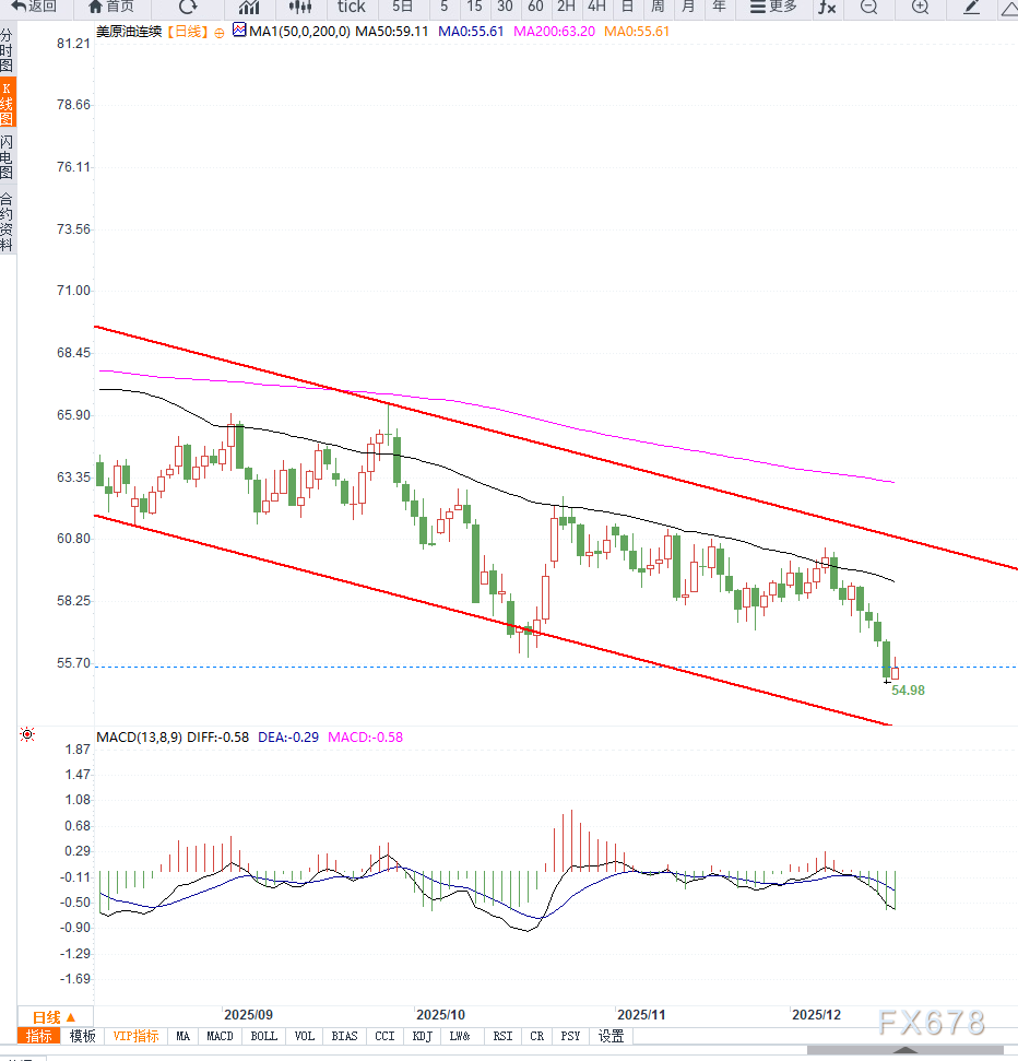 WTI近月合约运行在55.60美元/桶附近,价格已有效跌破前期整理区间,若进一步下行短期支撑位54.50美元,一旦失守,或指向52美元区域;