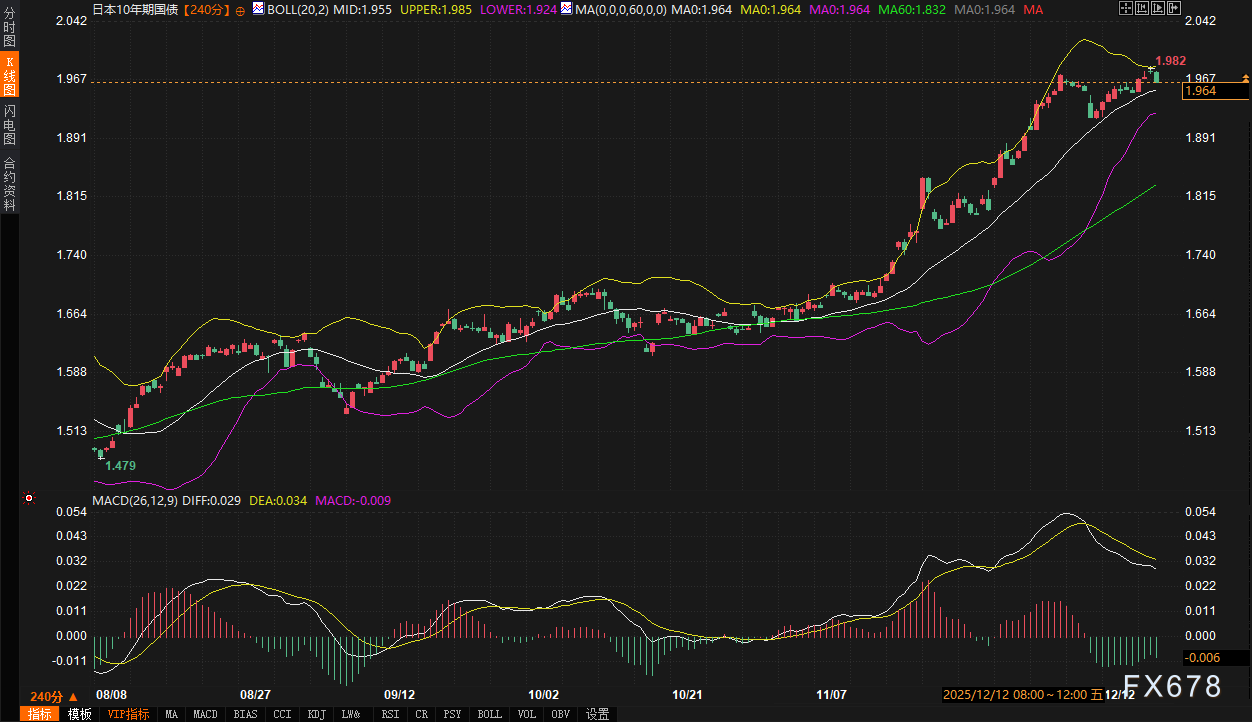 从技术面分析,10年期日债收益率240分钟图显示,当前报价1.964%正处于关键的技术位置。布林带中轨(1.955%)构成初步支撑,上轨(1.985%)与心理关口2.00%共同形成上方强阻力区间。MACD指标中,DIFF线与DEA线在零轴上方接近粘合,红柱动能收缩,显示短期上行动能有所衰减,市场处于方向选择前的整理状态。盘中需密切关注收益率对布林带中轨的争夺,若有效跌破,可能向下轨1.924%方向测试;反之,若决议后声明偏鹰,上破1.985%则可能打开通往2.02%-2.05%区间的空间。