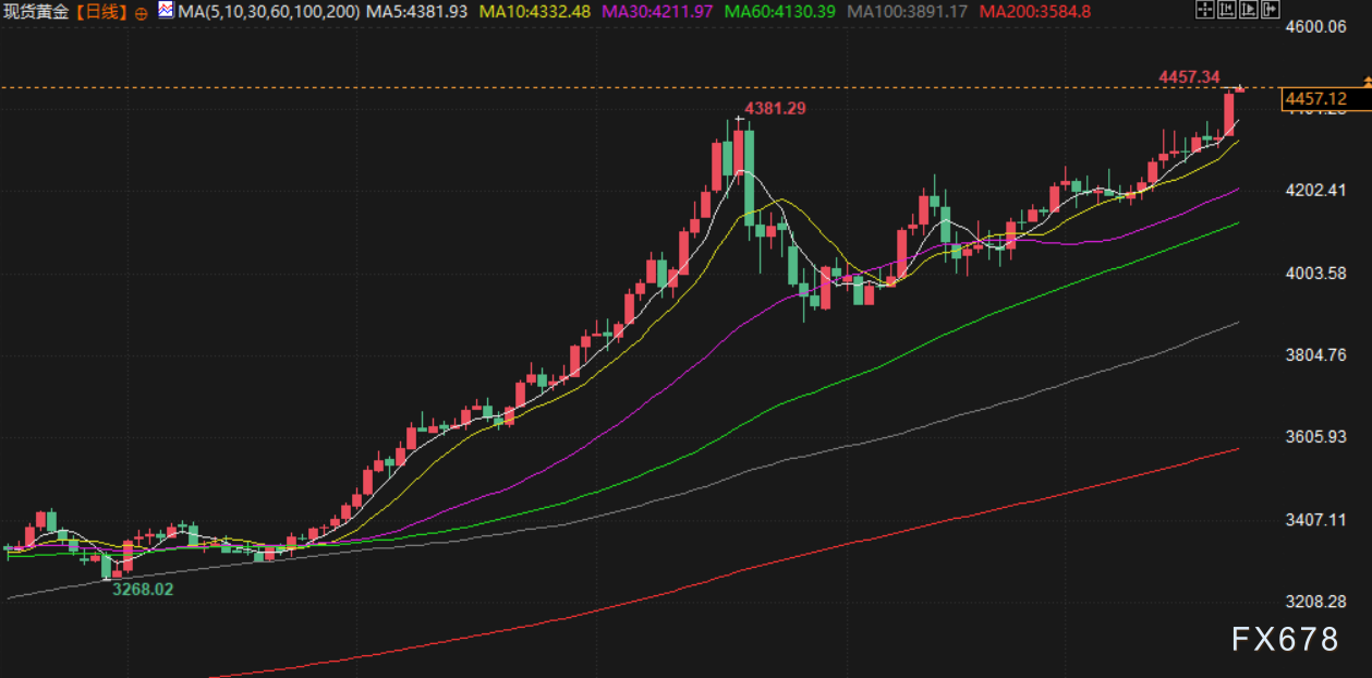 受地缘政治紧张局势加剧与市场预期美国货币政策可能转向的共同推动,黄金与白银价格周一大幅飙升,双双创下历史新高。现货黄金最高触及每盎司4459.50美元的纪录高位。现货白银同步上扬,最高升至69.42美元,年内累计涨幅已超过136%。