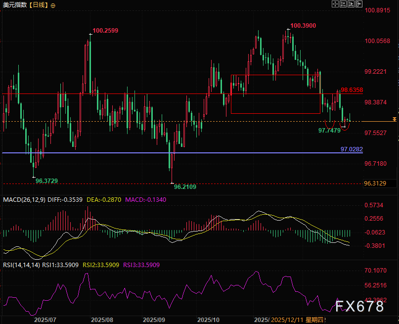 美元如果发起反弹,压力位在箱体下沿的98.10附近,以及98.63附近。